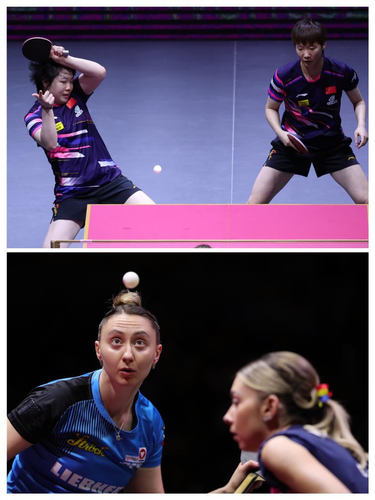 ↑王曼昱/蒯曼对战跨国组合波尔卡诺娃(左)/斯佐科斯