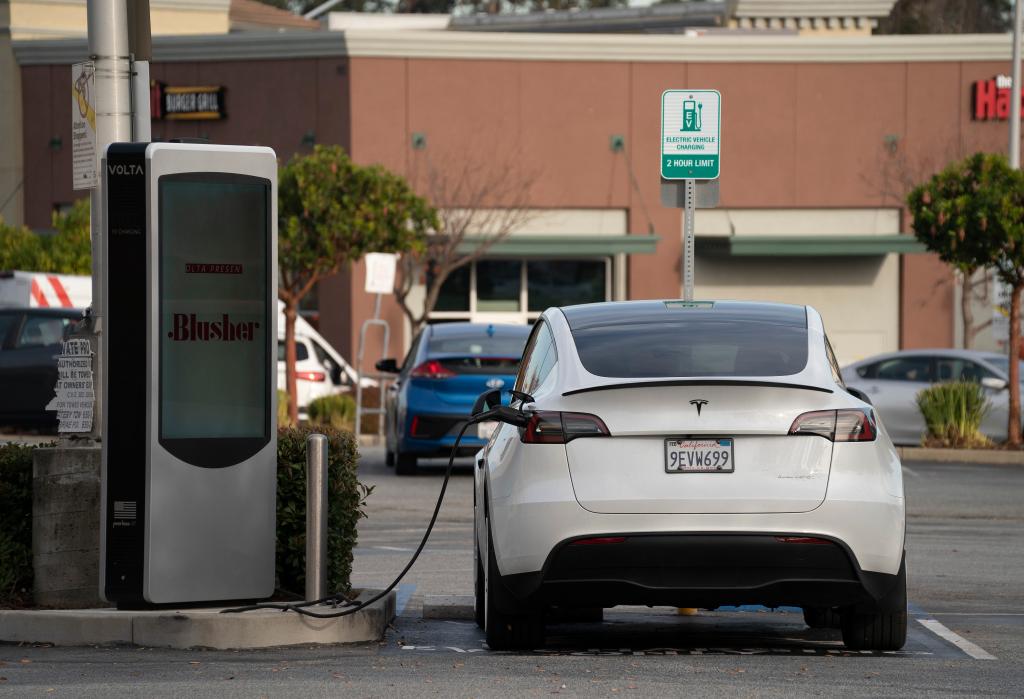 2023年12月13日,一辆特斯拉电动车在美国加利福尼亚州圣马特奥县一处停车场充电。新华社发(李建国摄)