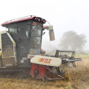 5月27日,在河南省信阳市淮滨县马集镇,履带式收割机在麦田作业收获弱筋小麦。新华社记者 郝源 摄