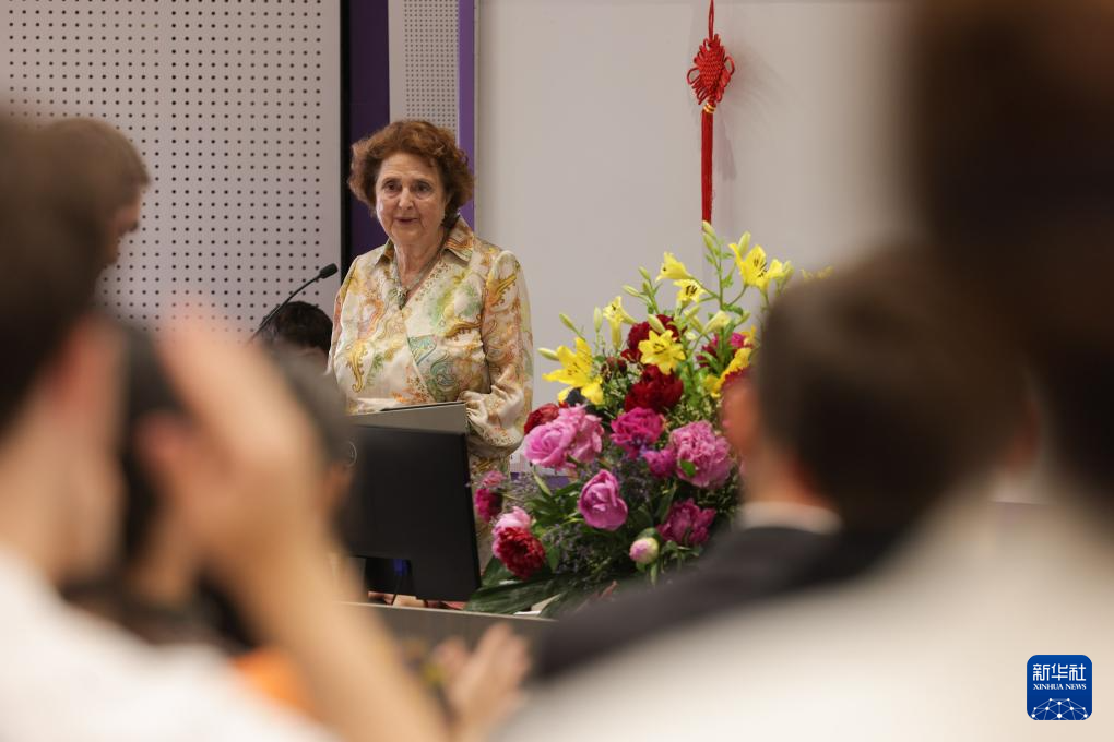 5月28日,在斯洛文尼亚首都卢布尔雅那,卢布尔雅那大学孔子学院斯方院长达妮耶拉·沃利奇在卢布尔雅那大学孔子学院成立15周年庆祝活动上致辞。新华社发(泽利科·斯特凡尼奇摄)