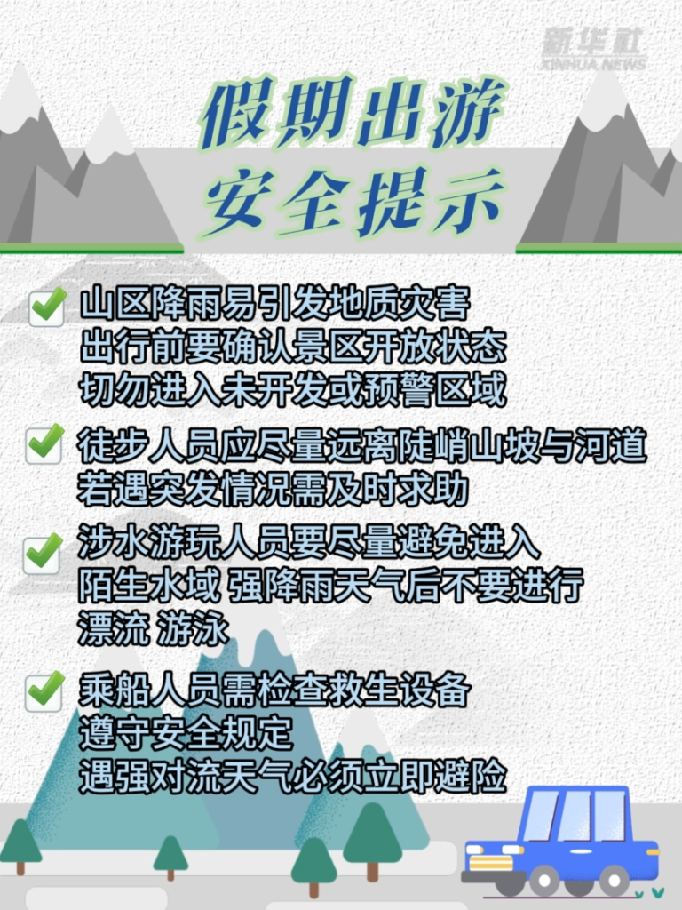 预计端午假期期间(5月31日至6月2日),中东部地区将有一次较大范围降水过程,湖北东部、江南、广西北部及西藏东南部、河南西南部、安徽中部、贵州、云南东部和西部等地相继会出现较强降雨,旅游出行气象风险等级较高。建议公众出行时要密切关注临近天气预报,提前做好相关旅游出行日程安排和必要防范措施。