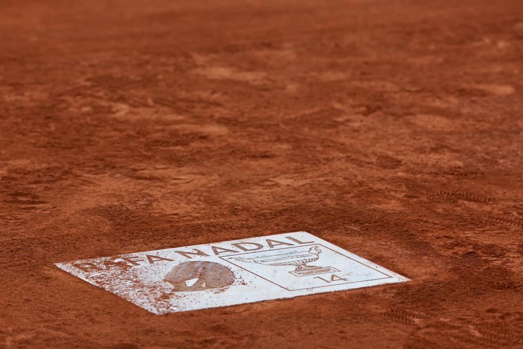 这是5月25日在菲利普·夏蒂埃球场拍摄的刻有纳达尔名字、鞋印和象征14个冠军奖杯的印章。