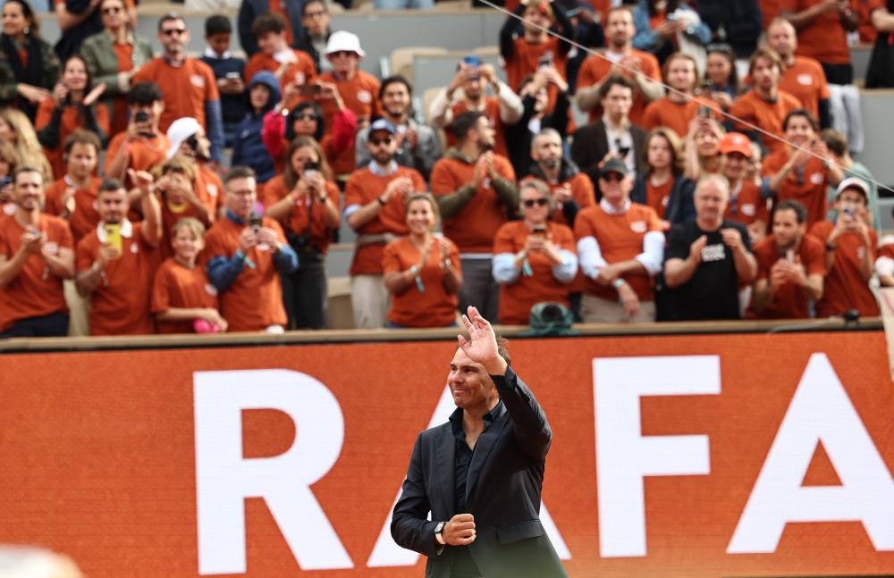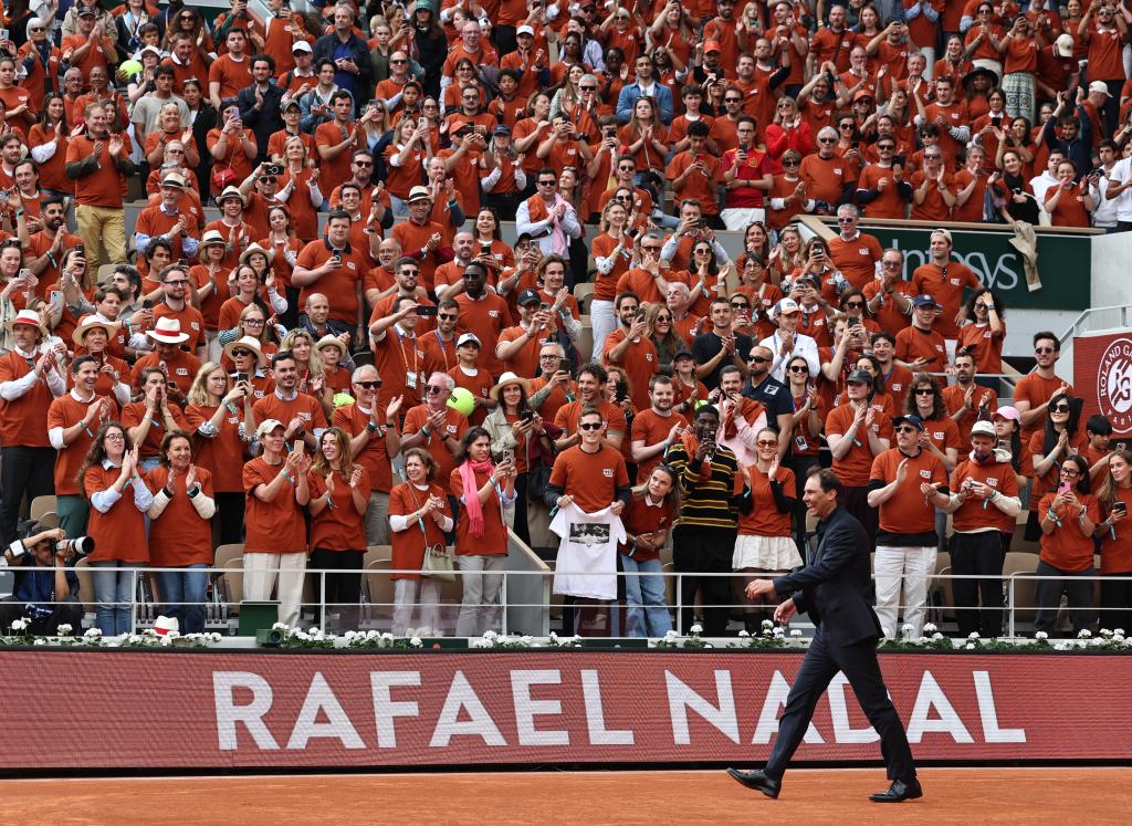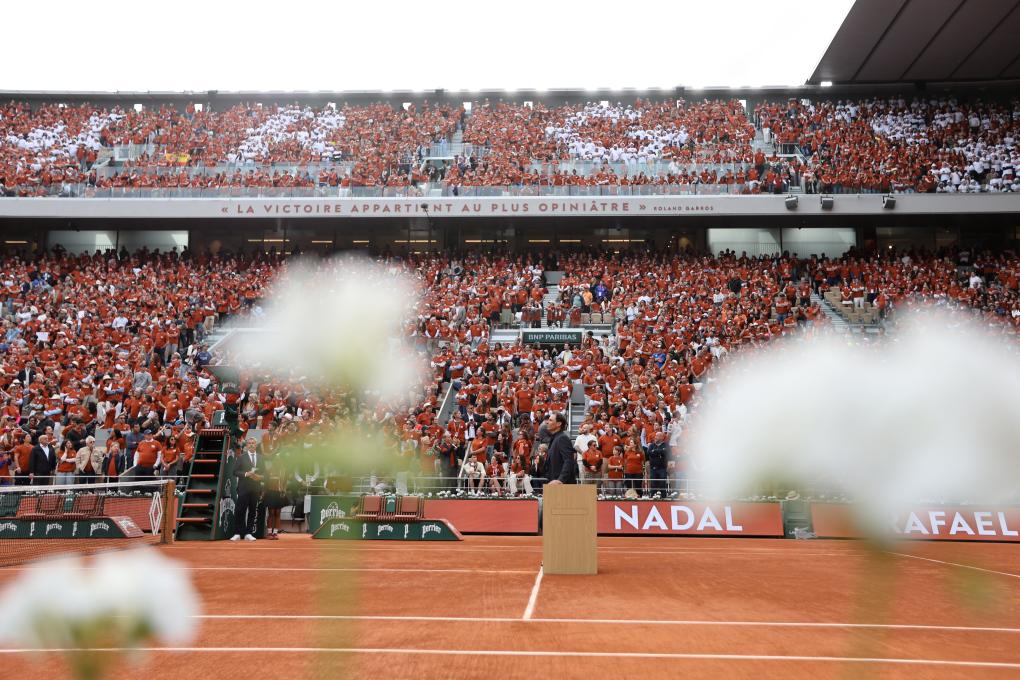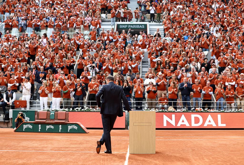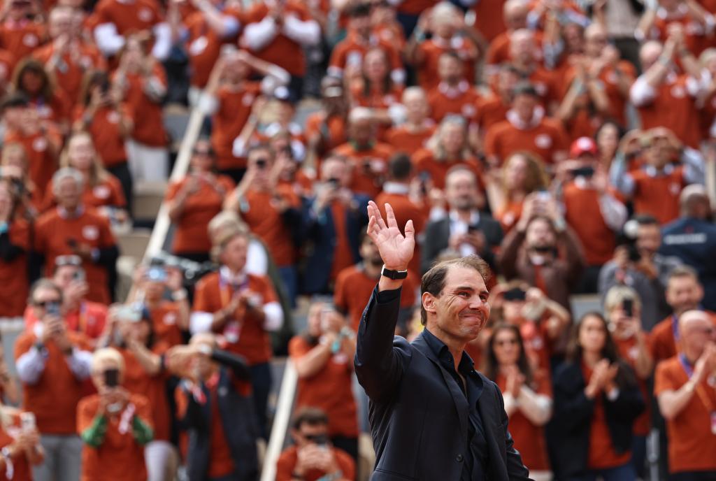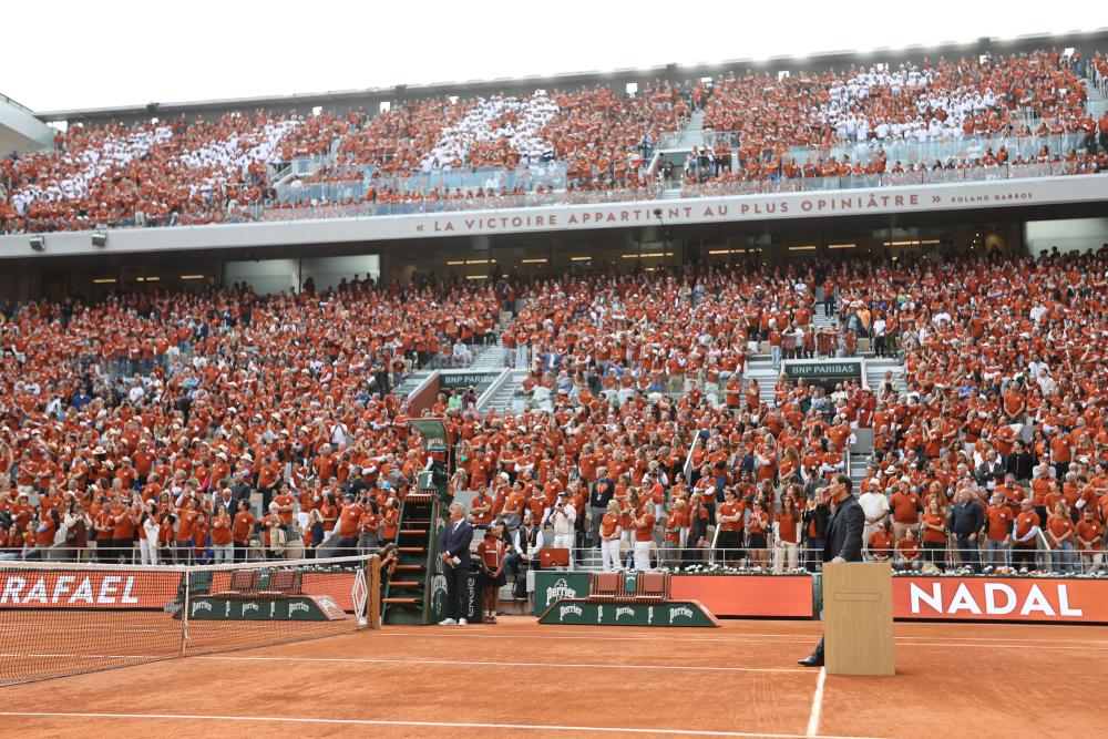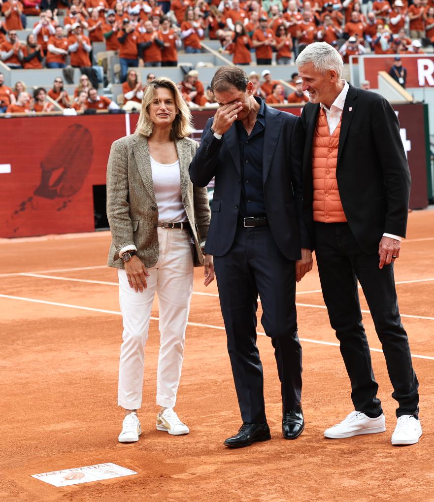 5月25日,法网赛事总监阿梅莉·毛瑞斯莫、纳达尔和法国网球协会主席吉勒·莫敦(从左至右)在致敬仪式上。
