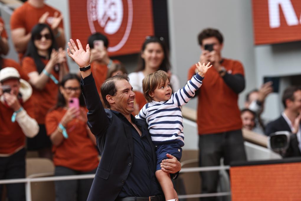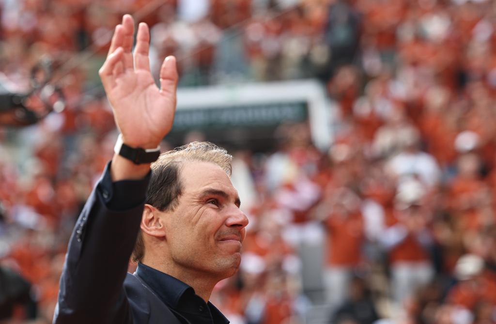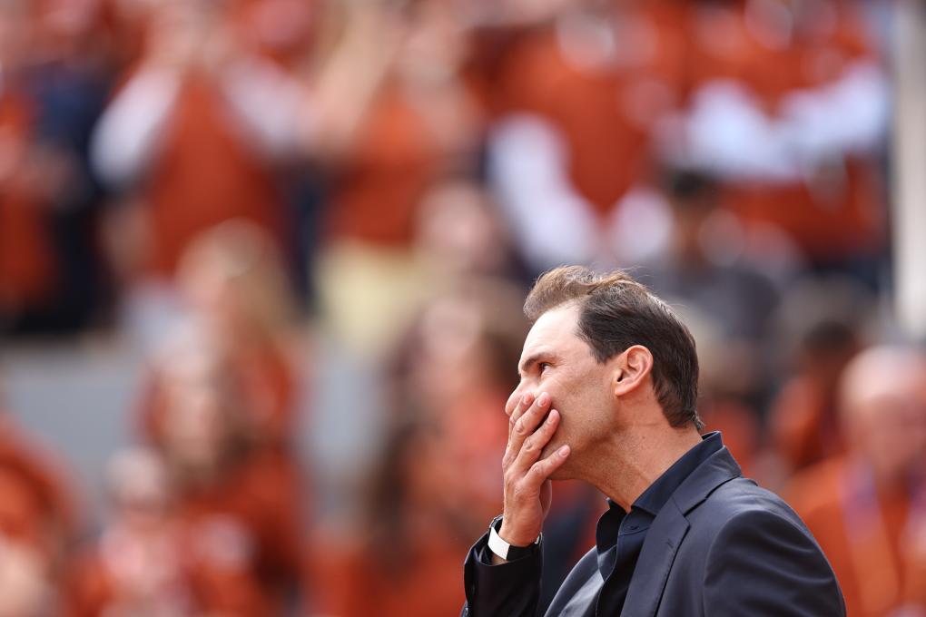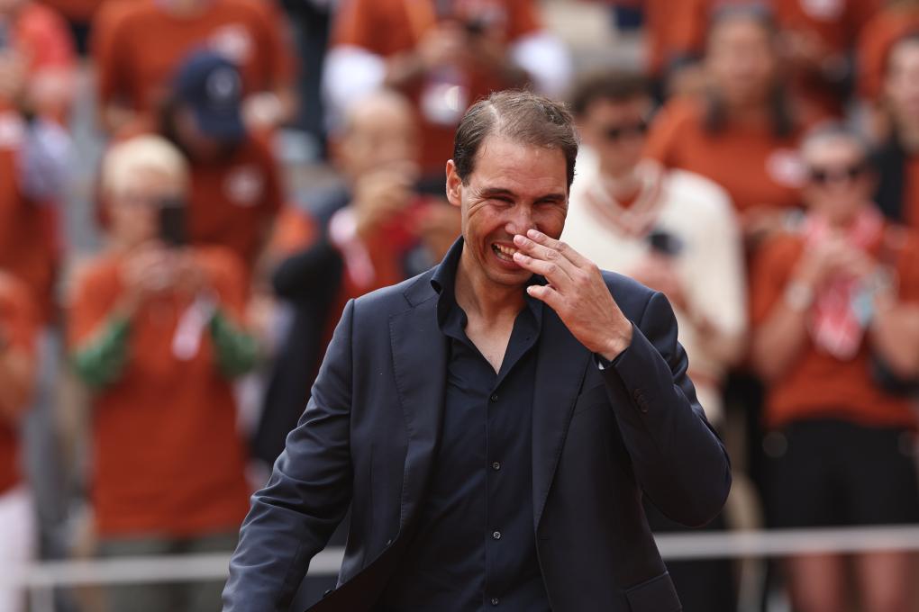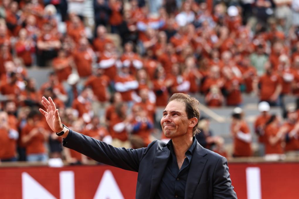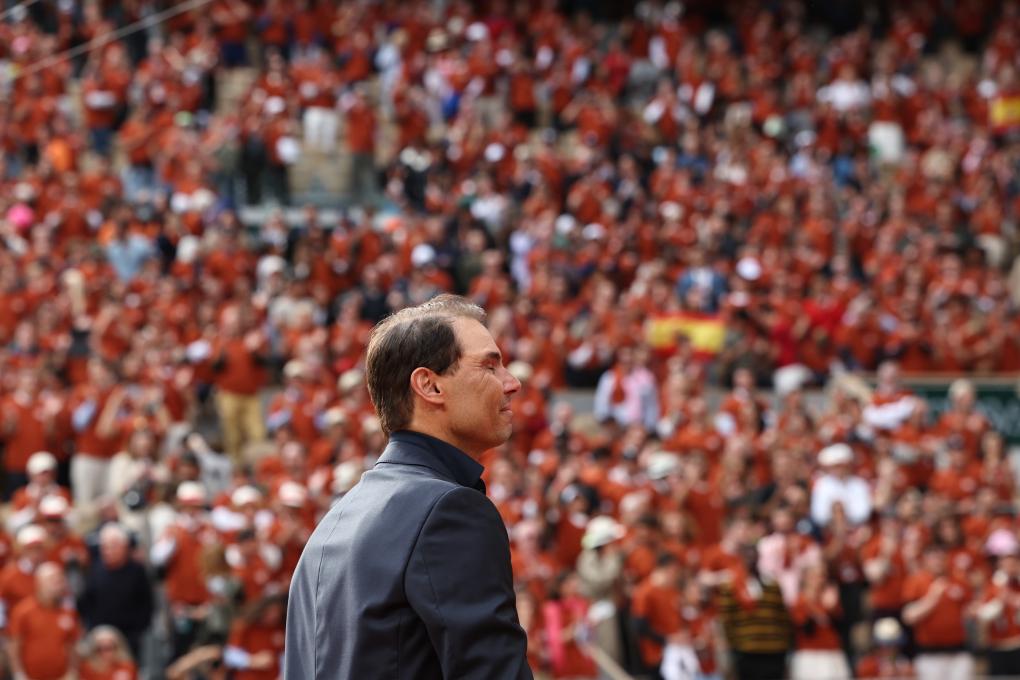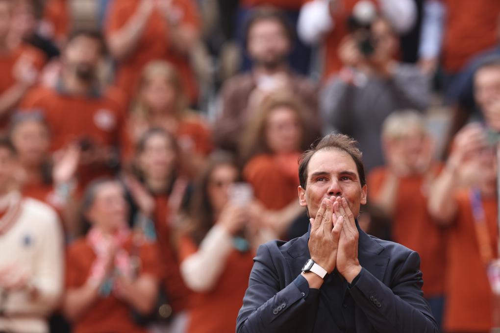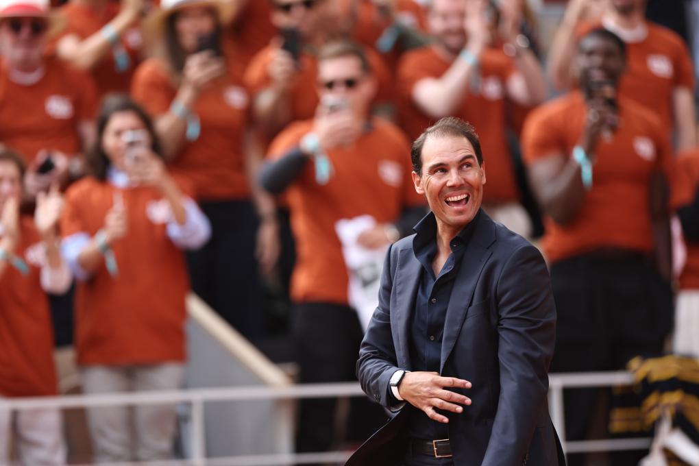 5月25日,法网赛事总监阿梅莉·毛瑞斯莫、纳达尔和法国网球协会主席吉勒·莫敦(从左至右)在致敬仪式上。