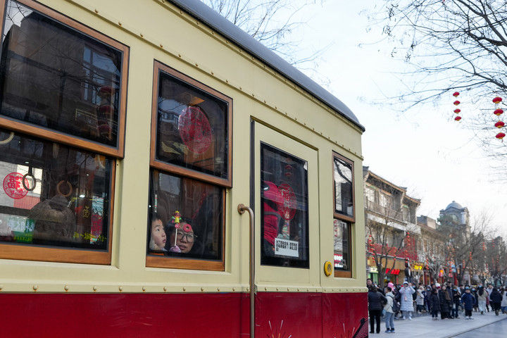 2025年1月29日,游客在前门大街乘坐“铛铛车”观光游览。