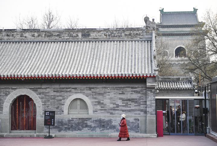 2024年1月18日拍摄的宏恩观山门殿与观外的北京钟楼。宏恩观地处北京钟鼓楼北侧、北京中轴线北端,拥有700余年历史,被称为中轴线上的“龙尾之要”。如今,通过保护性修缮与活化利用,宏恩观成为涵盖数字艺术展、宏恩观历史展、中轴线主题邮局、书店、文创商店等内容的市民文化空间。