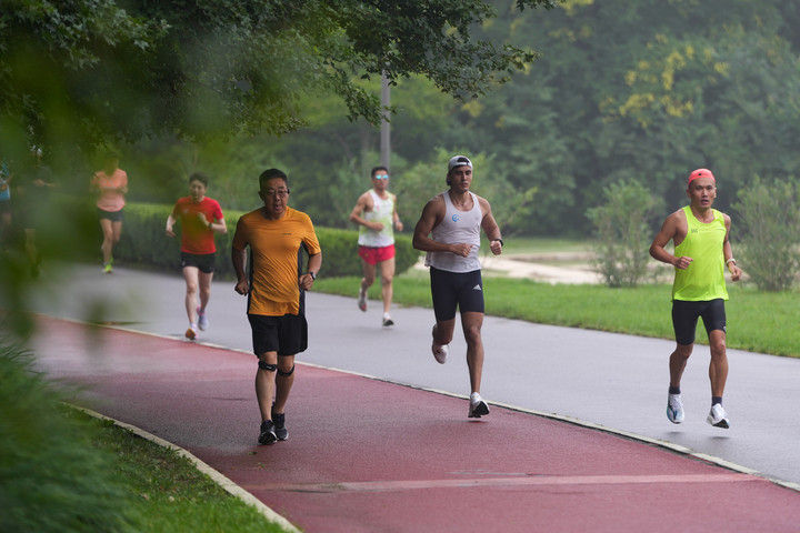 2024年7月14日,市民在北京中轴线延长线上的奥林匹克森林公园运动锻炼。