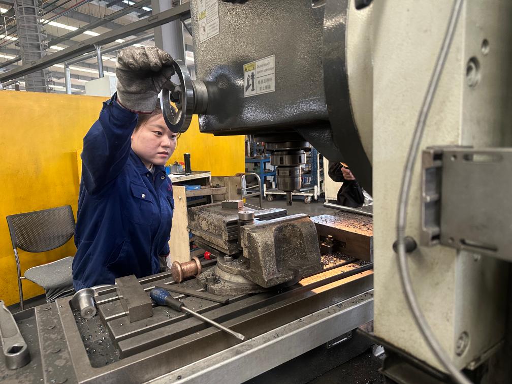 湖北工程职业学院学生崔贝贝在操作机床加工模具。(受访者供图)