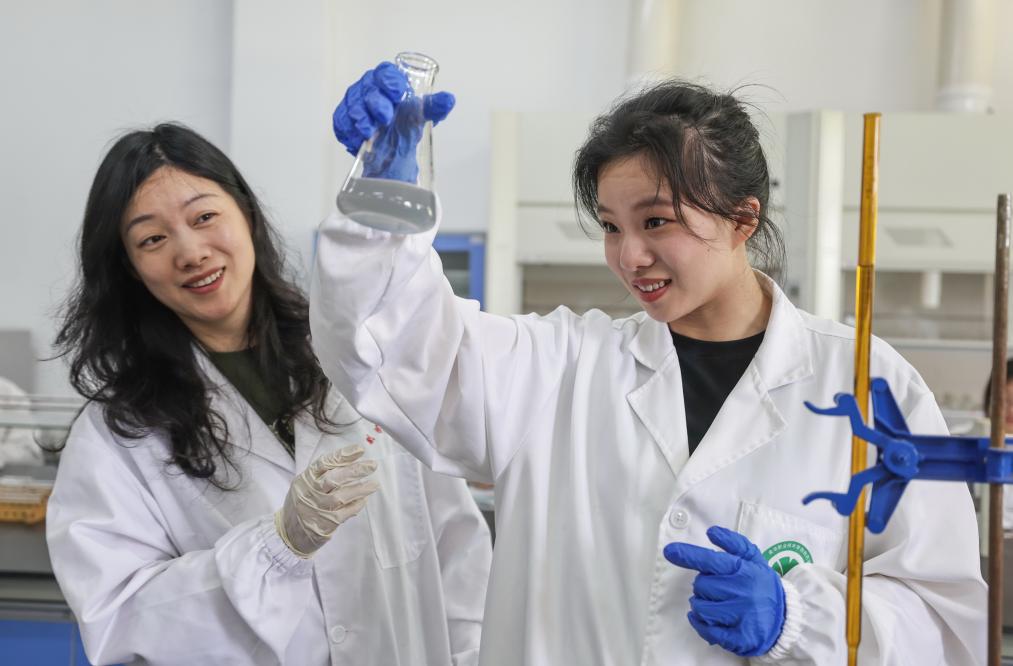 5月7日,学生戚鑫雅(右)和老师一起在浙江金华职业技术大学内进行自然水体中溶解氧的测定实验。新华社记者 张玉薇 摄