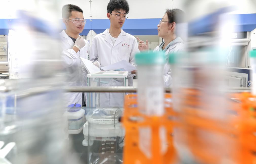 5月8日,学生何友景(中)在浙江金华职业技术大学老师指导下进行二氧化碳吸收转化实验。新华社记者 张玉薇 摄