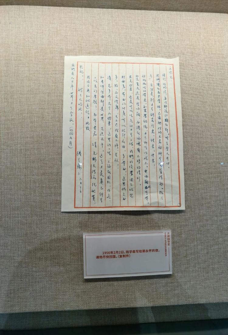 中国科学家博物馆主展厅展柜内,钱学森写给郭永怀请他尽快回国的信。新华每日电讯记者卢刚摄