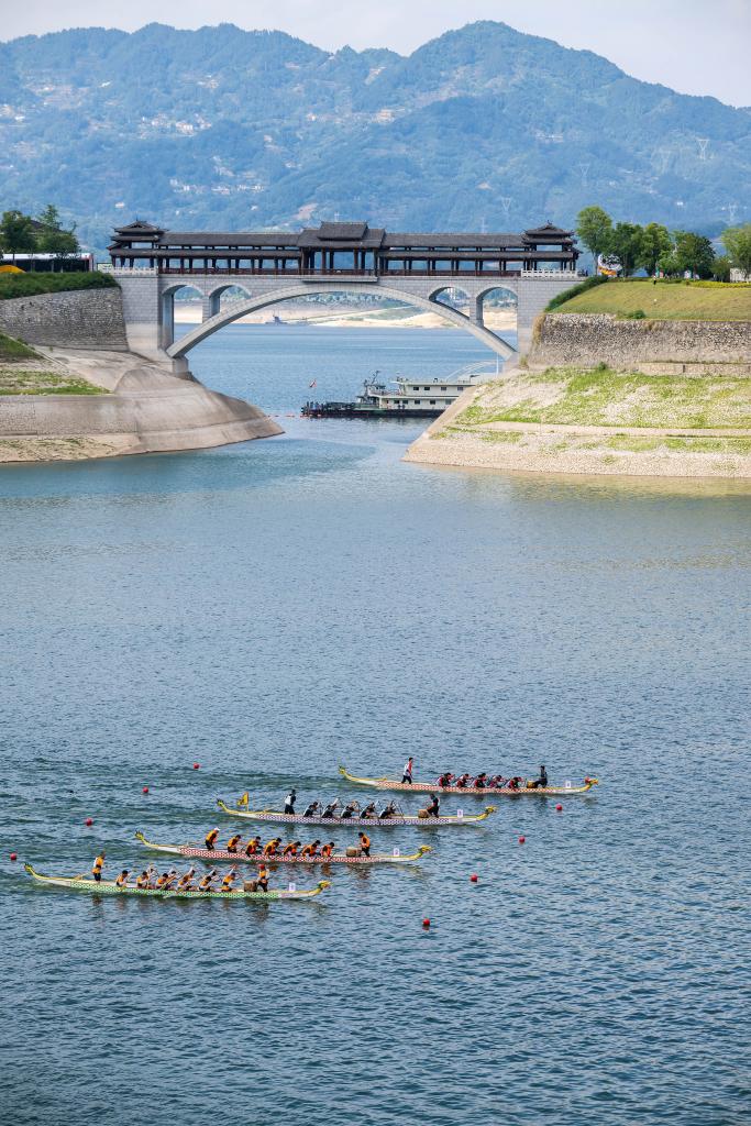 5月30日,参赛队伍在湖北省宜昌市秭归县徐家冲港湾水域举行的2025屈原故里传统龙舟大赛中赛龙舟。新华社发(郑家裕 摄)