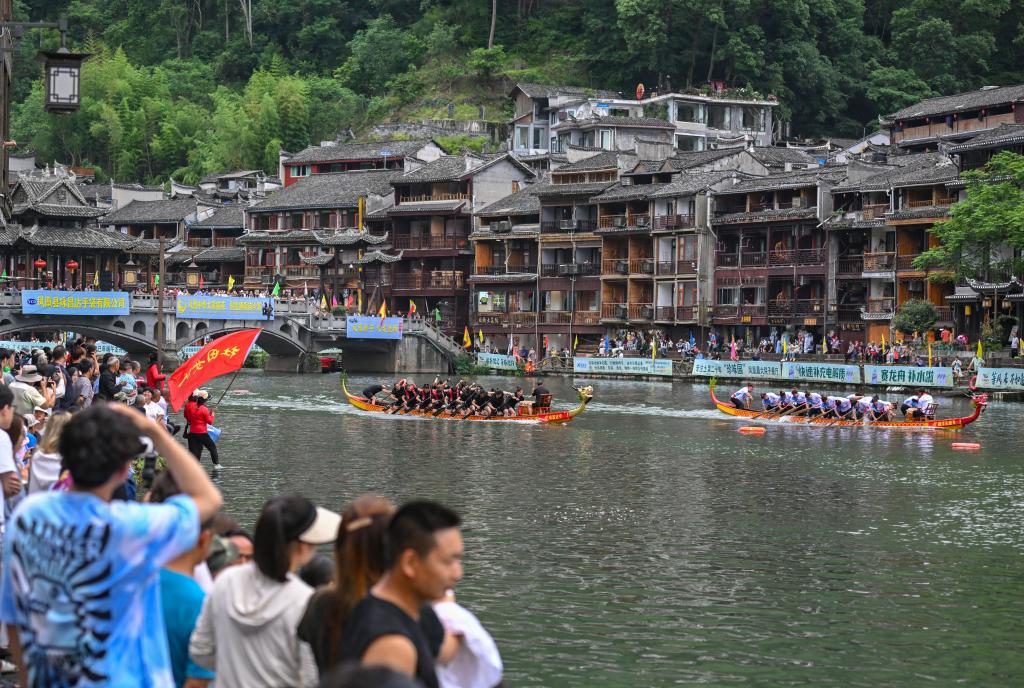 5月30日,在湖南省湘西土家族苗族自治州凤凰古城沱江沙湾河段,参赛队伍在进行龙舟比赛。新华社发(郭立亮 摄)