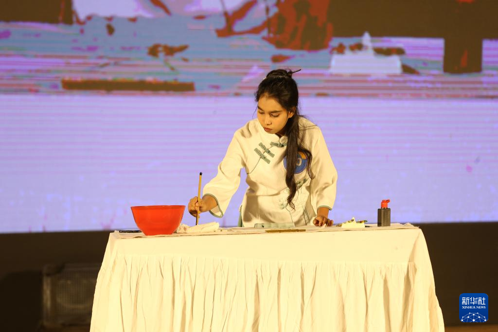 5月28日,在尼泊尔加德满都,一名选手在第24届“汉语桥”世界大学生中文比赛尼泊尔赛区决赛上展示才艺。新华社发(苏拉韦·什雷斯塔摄)