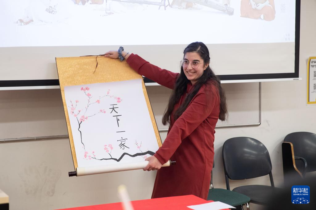 5月29日,在耶路撒冷希伯来大学,一名选手在第24届“汉语桥”世界大学生中文比赛以色列赛区比赛上展示书法。新华社记者 陈君清 摄