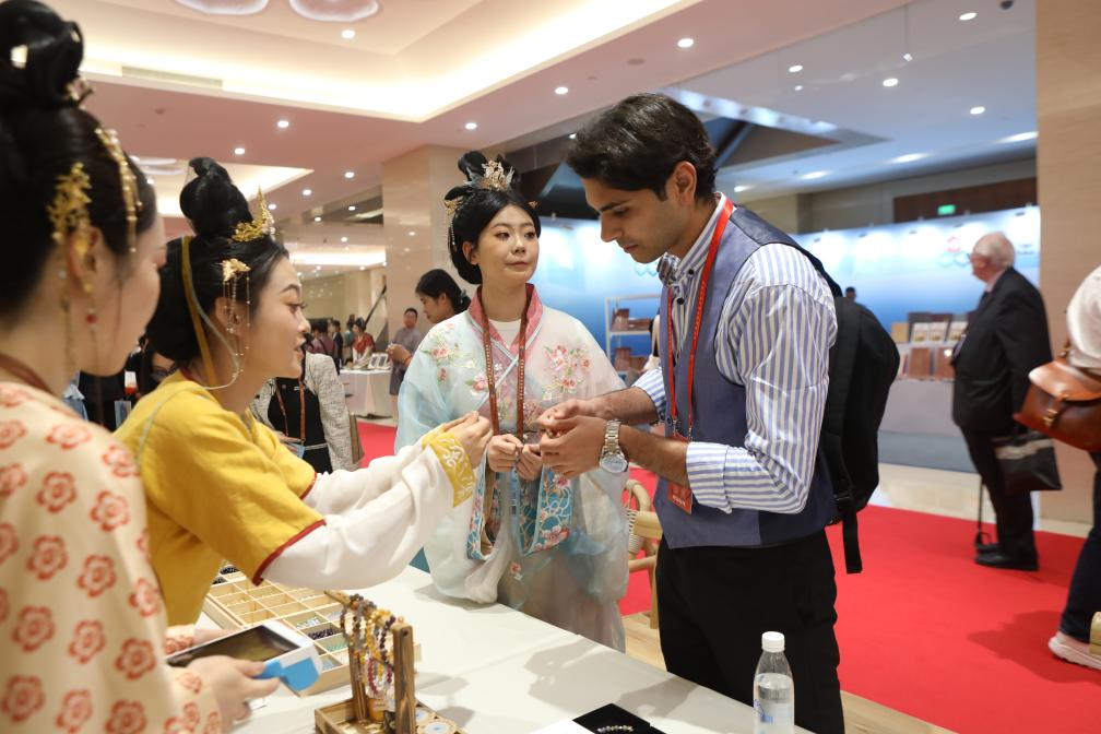 5月30日,第四届文明交流互鉴对话会嘉宾在开幕式后进行敦煌文化项目体验。新华社记者 张睿 摄