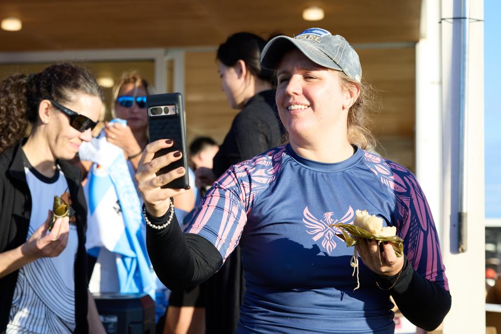 ↑2025年5月24日,阿根廷端午节龙舟大赛在布宜诺斯艾利斯省埃斯科瓦尔市龙舟基地内举行。这是一名参赛选手在比赛后手持粽子自拍。新华社记者 孟鼎博 摄