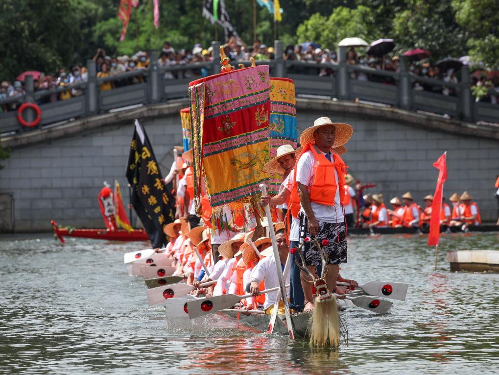 ↑每年端午前后,岭南不少村庄都会上演龙船走亲的活动。全国现存最老、已593岁的佛山盐步老龙,在广佛交界地区享有崇高知名度。这是2023年6月22日,佛山盐步老龙在锣鼓声中进入广州荔枝湾泮塘五约。 新华社记者 刘大伟 摄