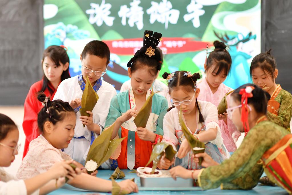 ↑2025年5月27日,在山东省青岛市市北区洛阳路第二小学开展的“浓情端午”主题活动中,学生们学习体验包粽子。新华社发(王海滨摄)