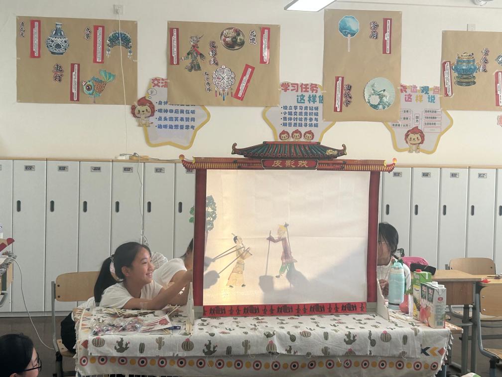 五年四班的教室则变成了临时“戏台”。一场以端午节为主题的皮影戏表演精彩呈现。伴着背景音乐,学生们拿着自制的屈原人物形象,将端午节的由来故事变得可看、可听、可触、可感,台下观众看得津津有味,鼓掌称赞。