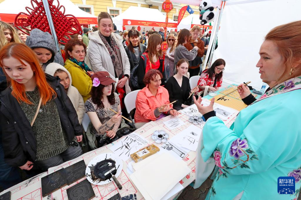 5月31日,在白俄罗斯首都明斯克,市民体验中国绘画。新华社发(任科夫摄)