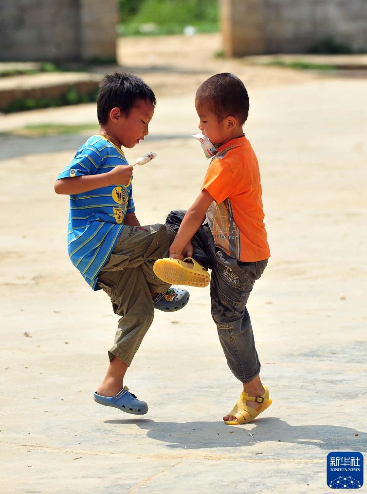 2012年5月3日,在广西大化瑶族自治县大化镇仁良村弄良小学,两名小学生一边吃零食,一边玩“斗驹”。新华社记者 黄孝邦 摄
