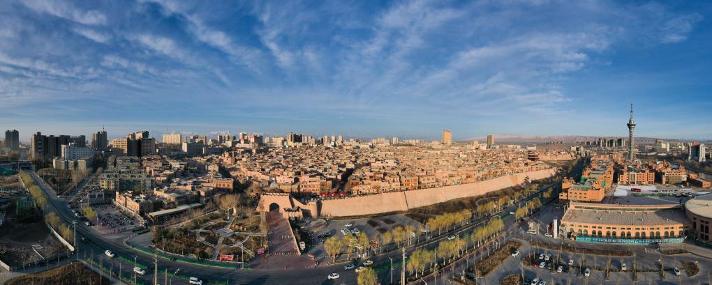↑清晨的喀什古城(2023年3月10日摄,无人机照片)。新华社记者 李响 摄