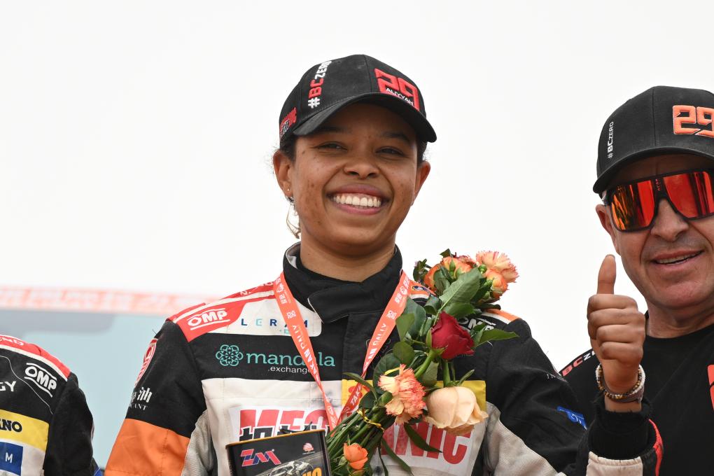 ↑6月1日,零公里润滑油ZM-Buggyra车队塞舌尔车手阿莉亚·科洛克参加收车仪式。新华社记者 辛悦卫 摄