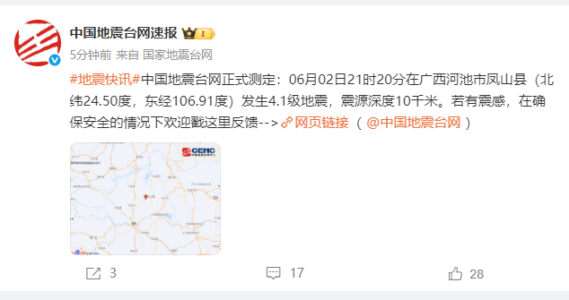 广西河池市凤山县发生4.1级地震 震源深度10千米