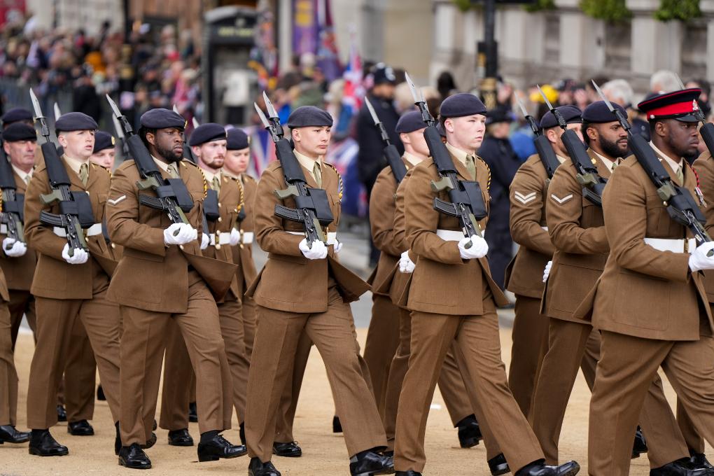 5月5日,在英国伦敦,军人参加阅兵仪式。当日,英国举行活动纪念第二次世界大战欧洲战场胜利80周年。新华社记者吴鲁摄