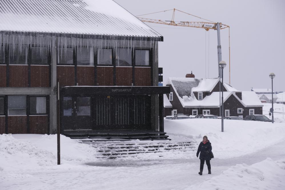 2025年3月24日,在丹麦自治领地格陵兰岛首府努克,一名行人经过格陵兰岛自治议会。新华社记者张玉亮摄
