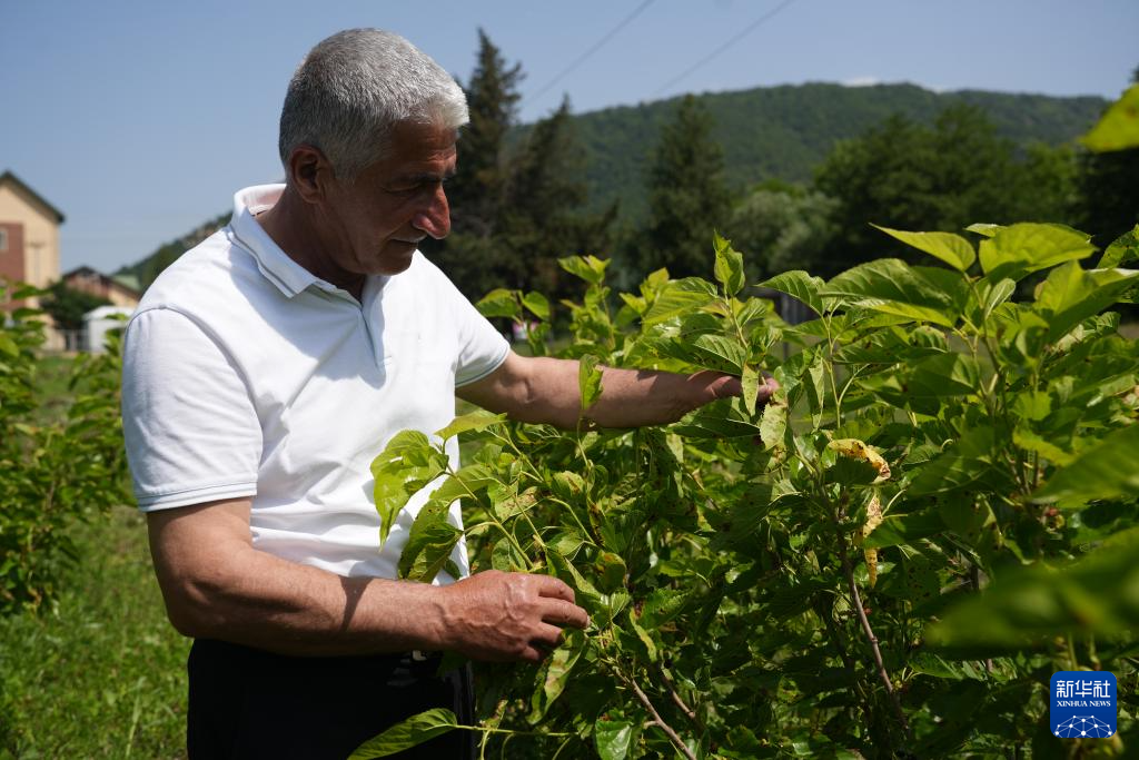 5月29日,阿塞拜疆加赫蚕种站总技术师马涅特查看中国引进桑苗的生长状况。新华社发(胡姆贝特·马马多夫摄)