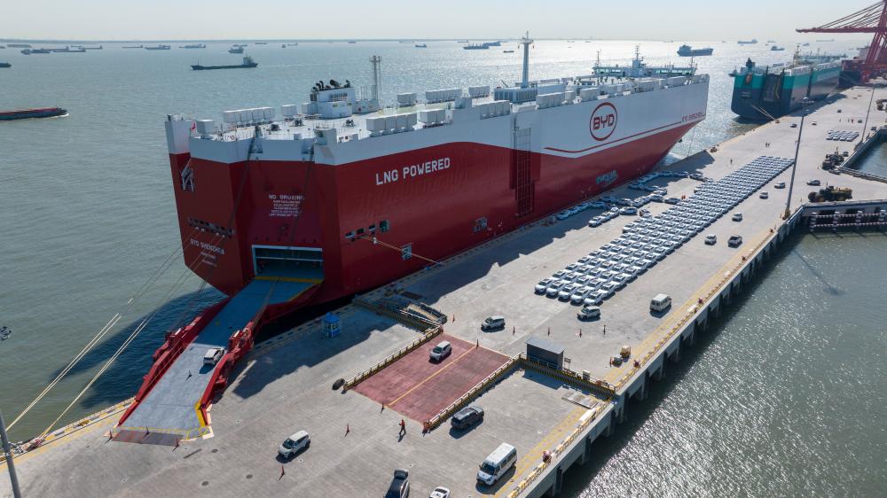 出口汽车在苏州港太仓港区码头集中装载上“深圳号”汽车运输船(2025年4月26日摄,无人机照片)。新华社发(王须中摄)
