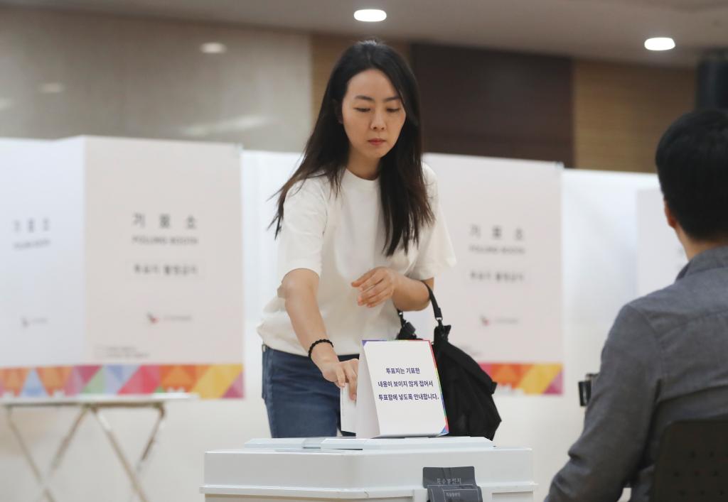 6月3日,韩国选民在首尔一处投票站投票。新华社记者姚琪琳摄