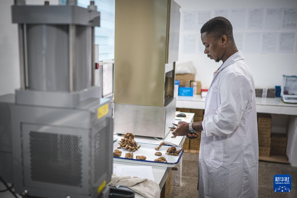 5月30日,在科特迪瓦圣佩德罗省大贝雷比镇,美兰集团橡胶加工厂的技术人员对橡胶进行质量测试。新华社记者 王冠森 摄