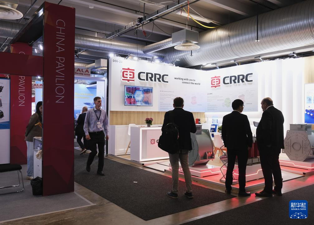 6月3日,在挪威利勒斯特伦举办的挪威国际海事展上,与会者参观中国馆。新华社记者 张玉亮 摄