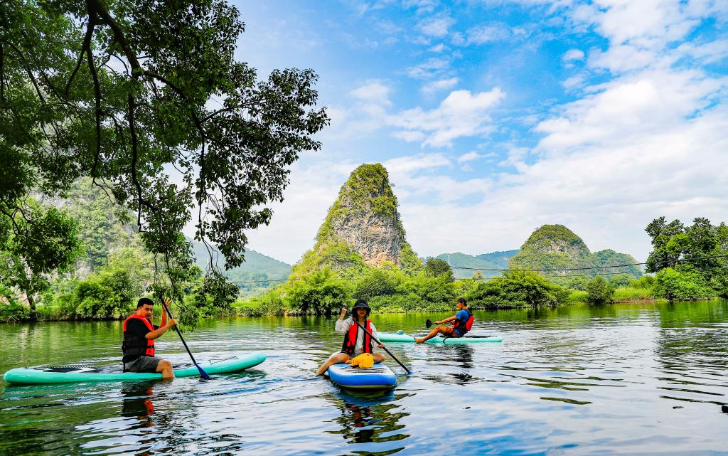 ↑游客在广西桂林划桨板。新华社记者 胡星宇 摄