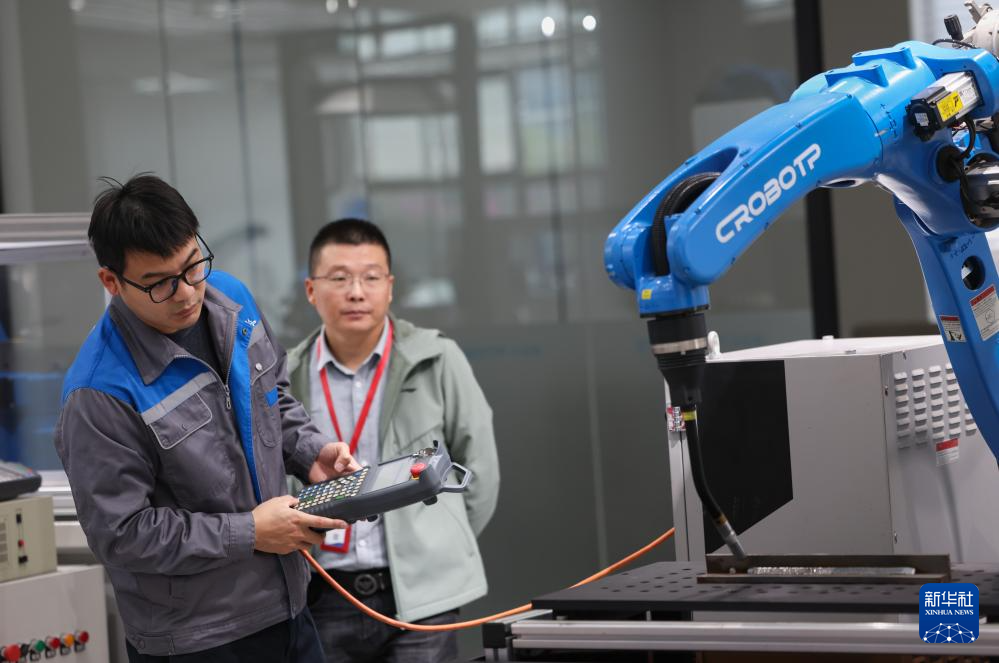 2024年11月13日,在成都卡诺普机器人技术股份有限公司,工作人员对工业机器人产品进行出厂前的测试。 新华社记者 江宏景 摄