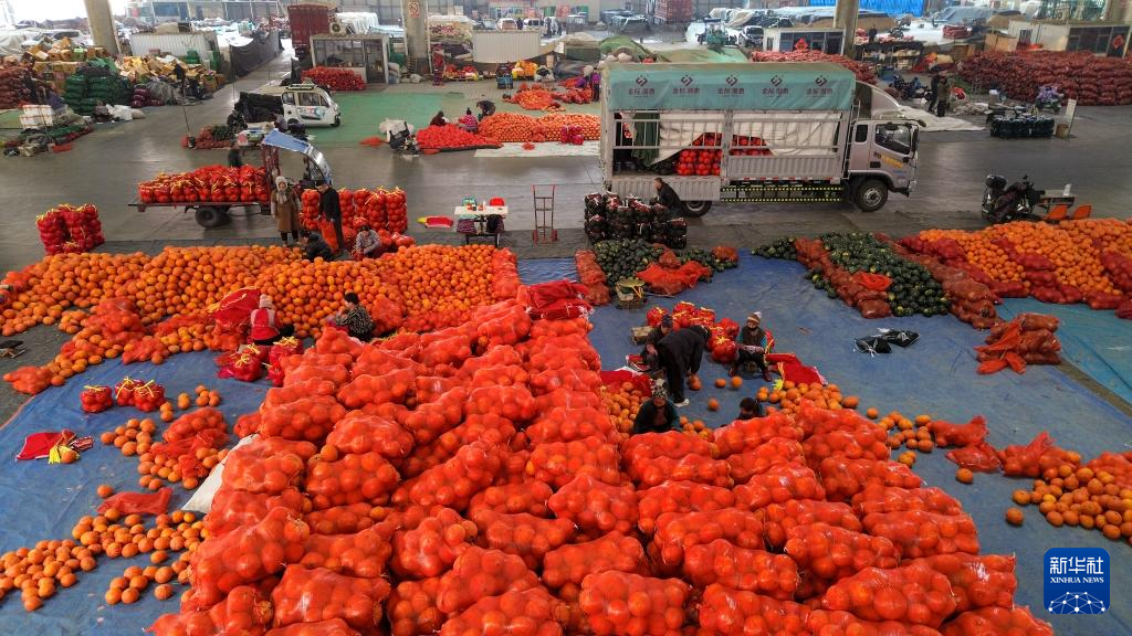 工作人员在山东寿光农产品物流园整理销往全国各地的蔬菜(1月21日摄,无人机照片)。 新华社记者 徐速绘 摄