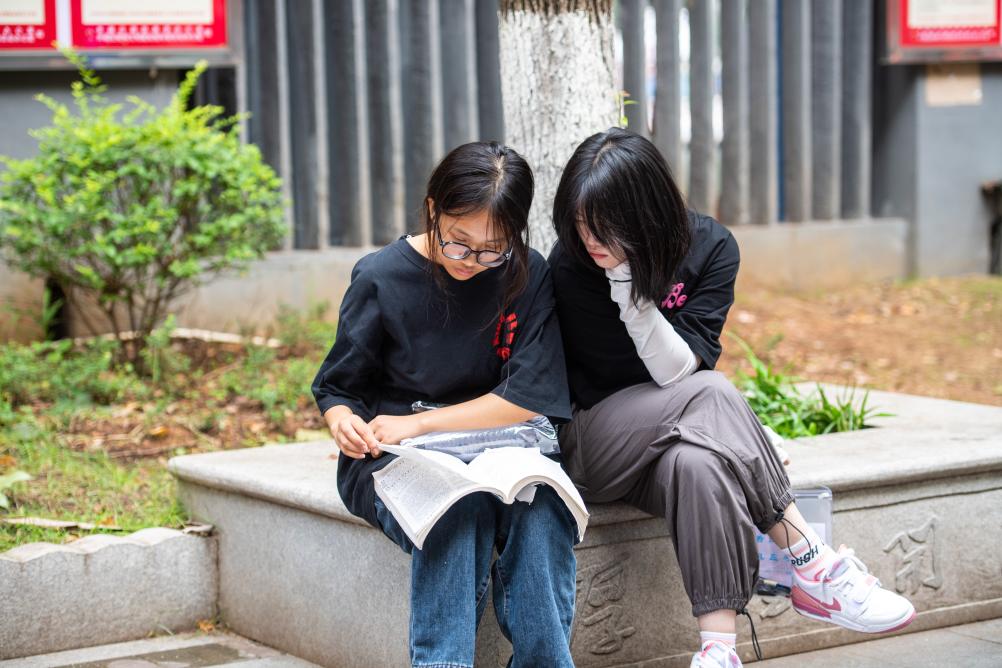 在湖南长沙市第一中学考点,考生在考场外复习(2023年6月7日摄)。新华社记者 陈思汗 摄