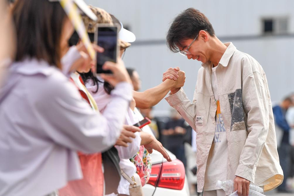在江苏省南京市建邺区中华中学考点,考生与送考人偶击掌(2024年6月7日摄)。新华社记者 李博 摄