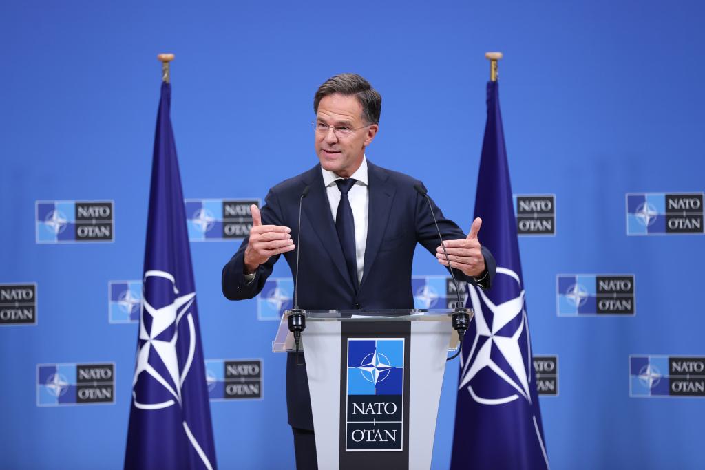 2024年10月1日,在位于比利时布鲁塞尔的北约总部,北约新一任秘书长马克·吕特在新闻发布会上讲话。新华社记者赵丁喆摄