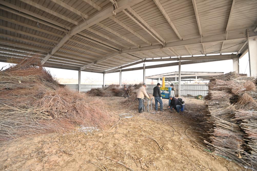 农牧民们正在使用割灌机加工红柳枝条。新华社记者 马金瑞 摄