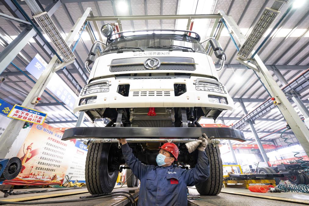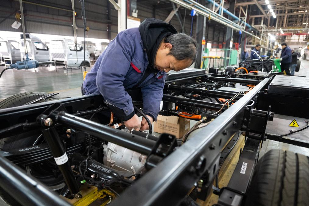 在湖北新楚风汽车股份有限公司总装车间,工人正进行新能源载货车装配作业。新华社记者肖艺九 摄