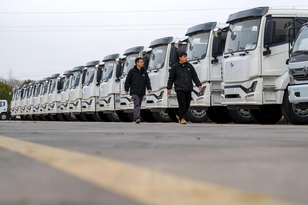 工作人员在湖北程力集团下线的成品车前巡查。新华社记者肖艺九 摄