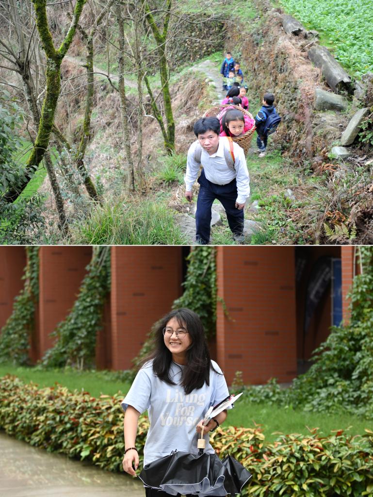 拼版照片。上图:在广西龙胜各族自治县龙脊镇江柳村,余启贵用背篓背着余茂鲜走在放学回家的路上(2013年2月26日摄)。下图:在桂林信息科技学院,余茂鲜下课后走在校园里(2025年5月29日摄)。