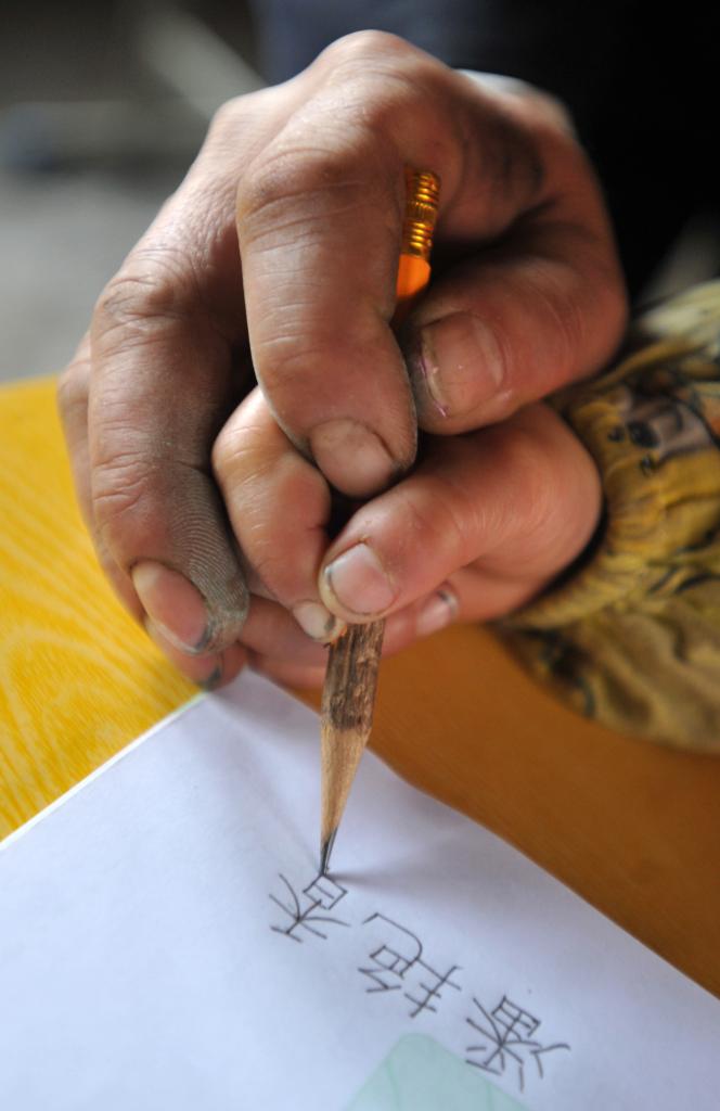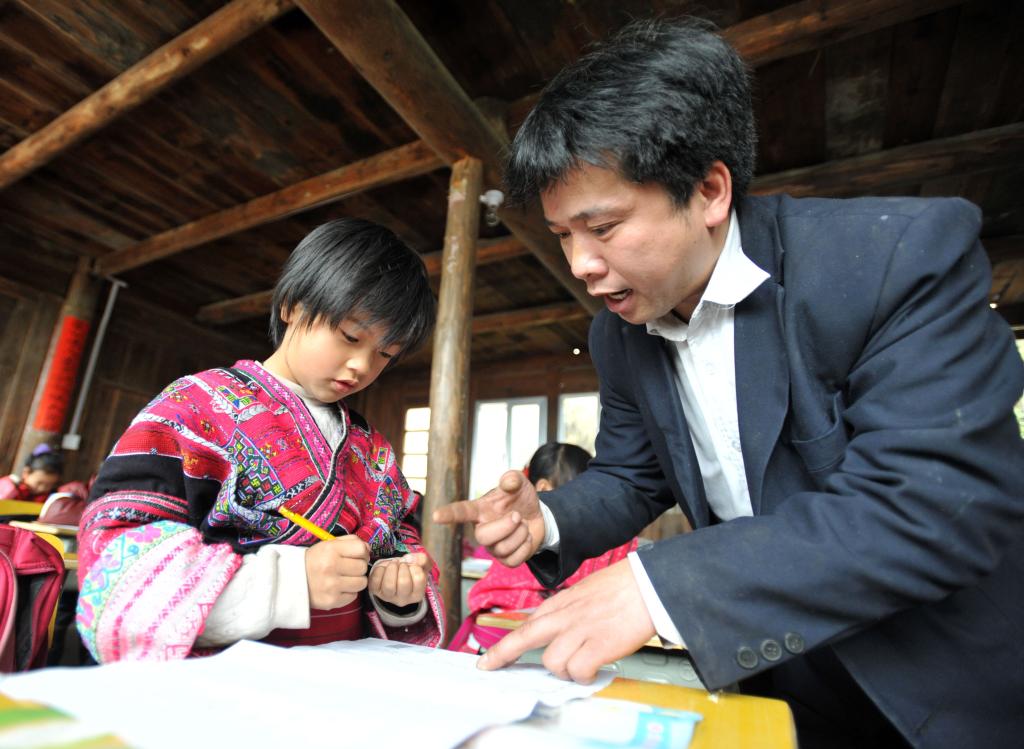 2013年2月26日,余启贵在课堂上握着一个学生的手教她写名字。