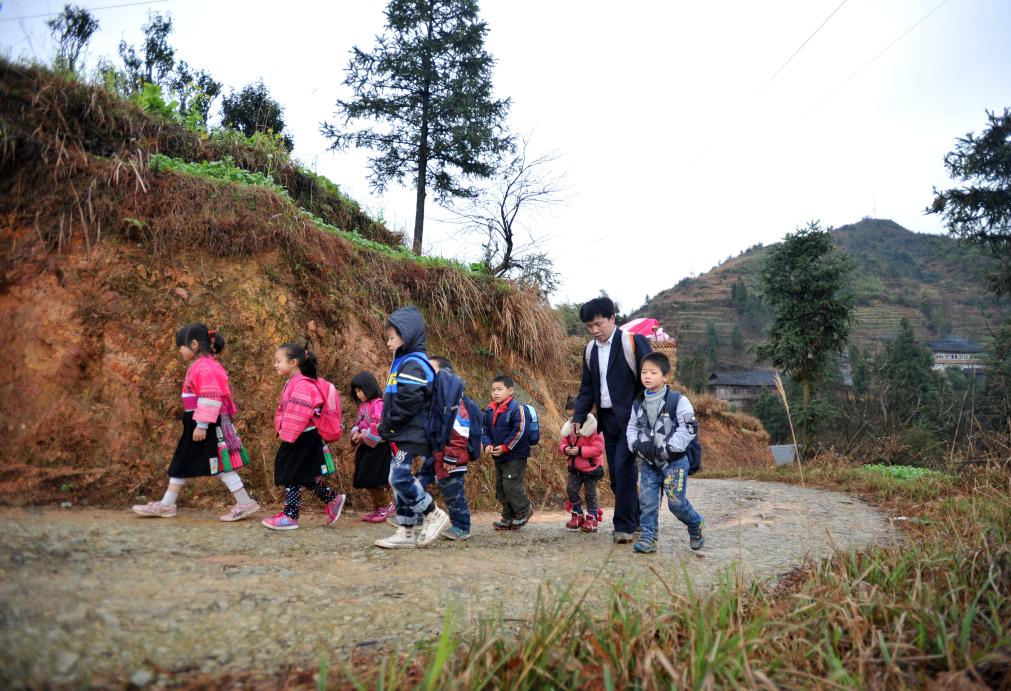 2013年2月26日,余启贵背着背篓领着孩子们走在上学的路上。