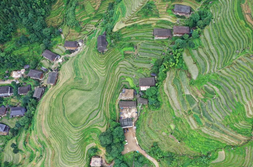 这是广西龙胜各族自治县龙脊镇江柳村翁江小学所在的村寨(2020年7月7日摄,无人机照片)。
