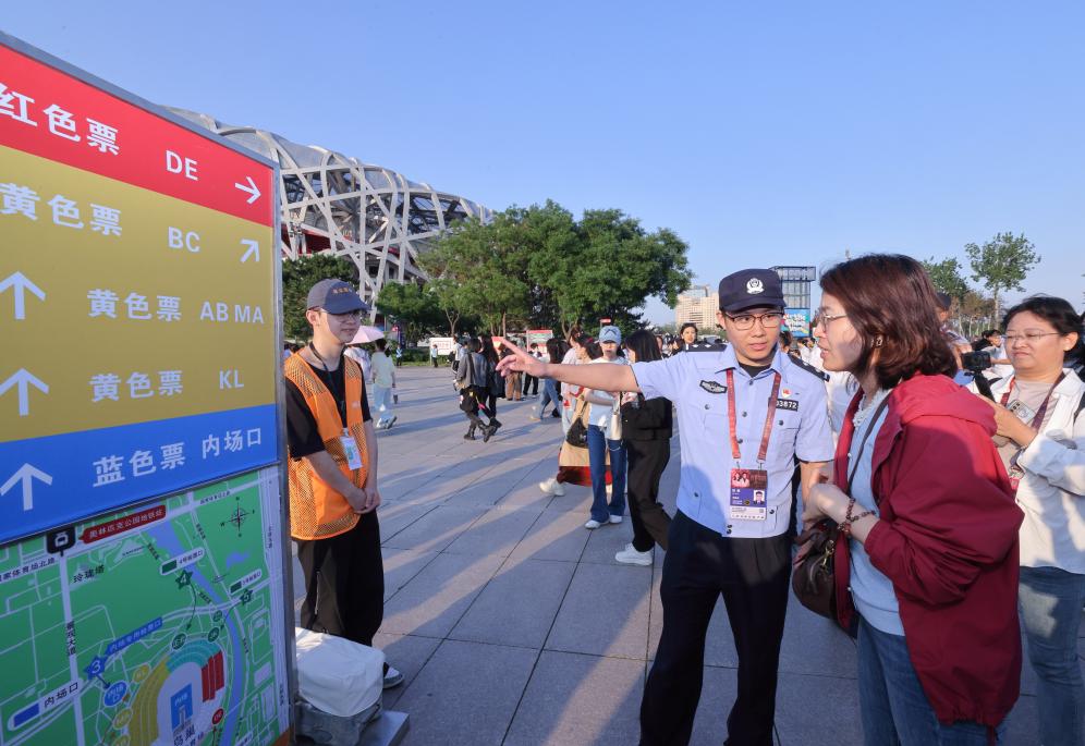 5月23日,北京市公安局治安总队民警在国家体育场外引导观众入场。新华社记者 殷刚 摄